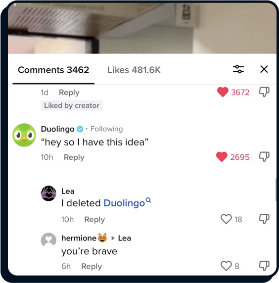 Perhaps the best example of this in present day marketing amongst Gen Z and under is Duolingo. Duolingo has no right to be as popular as it is—it's an educational app, and we all know how people feel about school. But they have done such a killer job being in the right place almost every time, that people come to expect and look forward to their comments in the comment sections of reels they like. At the very least, it’s always a pleasant surprise. Often, that familiarity ends up with people getting curious enough to click on their platform, and then they get wrapped up in the community that is there.