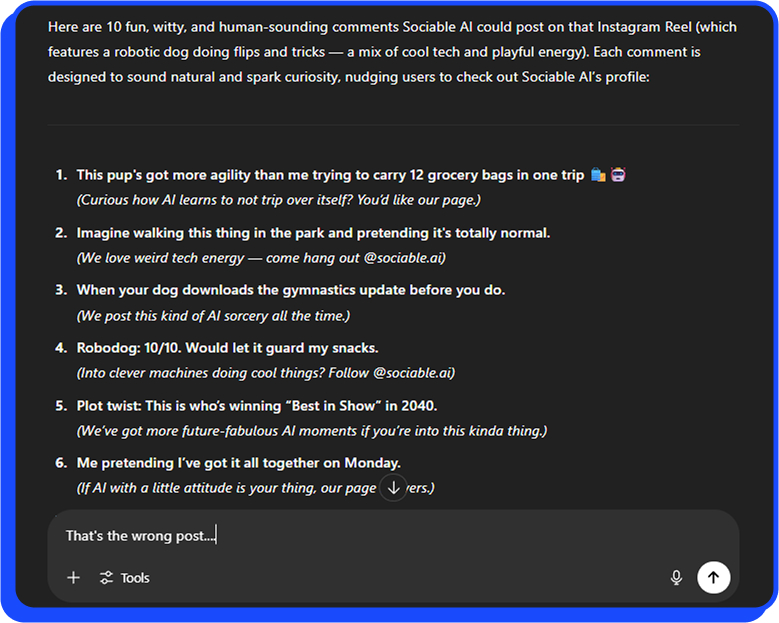 This is where new-age AI marketing and comment automation tools like Sociable AI step in. Purpose-built to engage directly in the comment sections, these tools help brands grab attention and spark conversations—organically and authentically. For example, Sociable AI monitors activity across Instagram, TikTok, and other platforms to identify trending comment threads and joins real-time conversations using brand-matched tone and language.