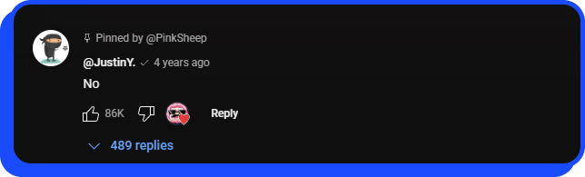 One of Justin Y’s viral comments that earned 86K likes and 489 comments 4 years ago, an early example of comment marketing success. His comments are so popular now that people view videos just to hunt for them.